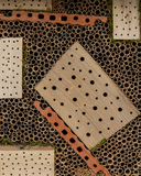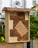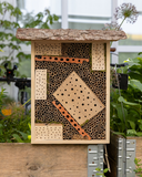 Der Inhalt dieser Wildbienennisthilfe besteht unter anderem aus verschiedenen einheimischen Hölzern wie Eiche, Buche, Esche, Haselnuss und Schilf sowie Pappröhrchen, Strangfalzziegeln und Schamottstein. Das Dach ist aus einem Schwartenbrett mit Holzrinde.