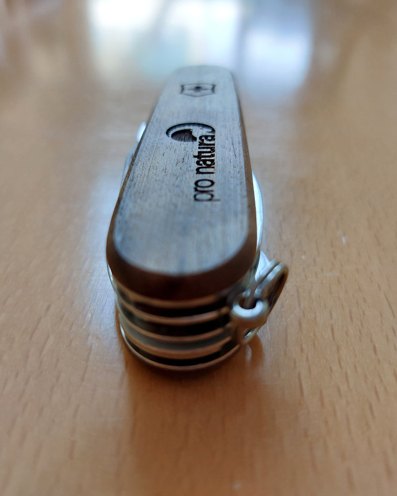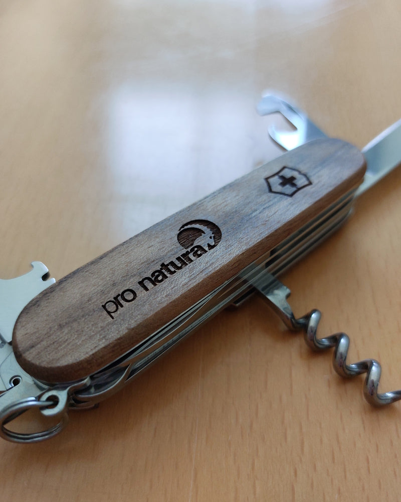 Pro Natura Taschenmesser aus zertifiziertem europäischem Nussbaumholz, hergestellt in einem umweltfreundlichen Verfahren vom Schweizer Traditionsunternehmen Victorinox. Das Taschenmesser verfügt über eine grosse und eine kleine Klinge, Korkenzieher, Dosenöffner, Schraubendreher 3 mm, Kapselheber, Schraubendreher 6 mm, Draht-Abisolierer, Stech-Bohr-Nähahle, Schere, Holzsäge, Mehrzweckhaken und Ring. Mit der Ausstattung dieses Taschenmessers sind Sie für jeden Ausflug in die Natur perfekt gerüstet.