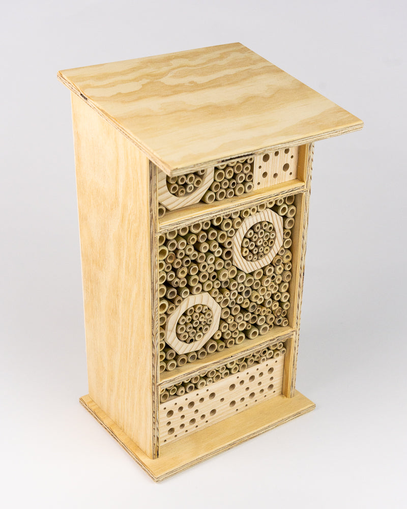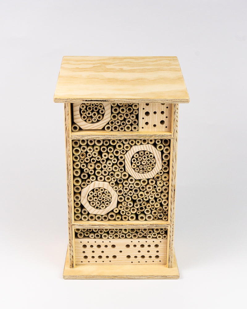 Die Wildbienennisthilfe für Garten und Balkon sollte vorzugsweise an einem wind- und regengeschützten Ort aufgestellt werden. Die Nisthilfe wird von den Werkstätten Bern aus einheimischem Eschenholz und Bambusröhrchen gefertigt – beides mit unterschiedlichen Lochgrössen, um verschiedene Arten zu bedienen. Ein Begleitheft liegt bei. Grösse: 20 x 18 x 35 cm.