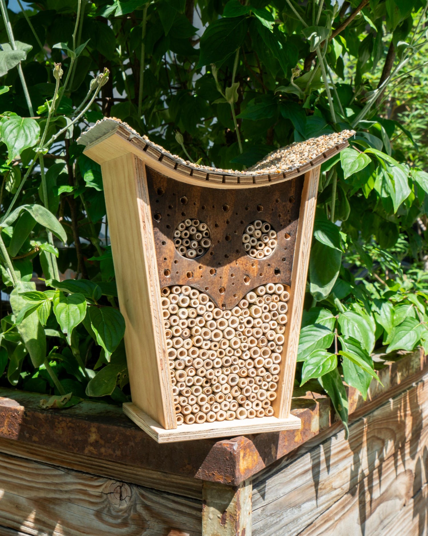 Die Wildbienennisthilfe für Garten und Balkon sollte vorzugsweise an einem wind- und regengeschützten Ort aufgestellt werden. Die Nisthilfe wird von den Werkstätten Bern aus einheimischem Eschenholz und Bambusröhrchen gefertigt – beides mit unterschiedlichen Lochgrössen, um verschiedene Arten zu bedienen. Ein Begleitheft liegt bei.