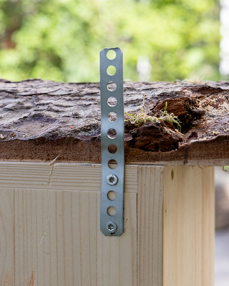 Der Inhalt dieser Wildbienennisthilfe besteht unter anderem aus verschiedenen einheimischen Hölzern wie Eiche, Buche, Esche, Haselnuss und Schilf sowie Pappröhrchen, Strangfalzziegeln und Schamottstein. Das Dach ist aus einem Schwartenbrett mit Holzrinde.