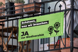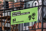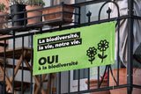 Le drapeau en polyester recyclé mesure 300 x 100 cm.