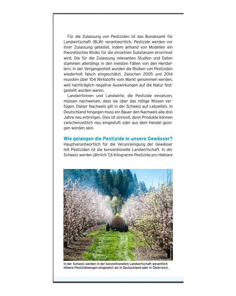 Ruisseaux et rivières, des milieux naturels abritant une grande variété de plantes et d’animaux, sont fortement menacés par les pesticides, avant tout utilisés dans l’agriculture conventionnelle afin de protéger les plantes cultivées contre les champignons, les insectes et les mauvaises herbes. Ces substances se répandent dans l’air, la terre et l’eau, et se retrouvent aussi dans les aliments et l’eau potable, loin des champs traités.