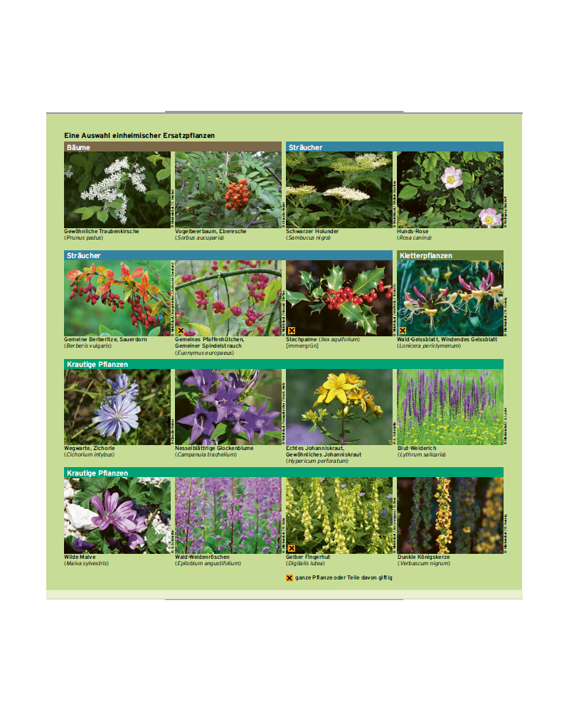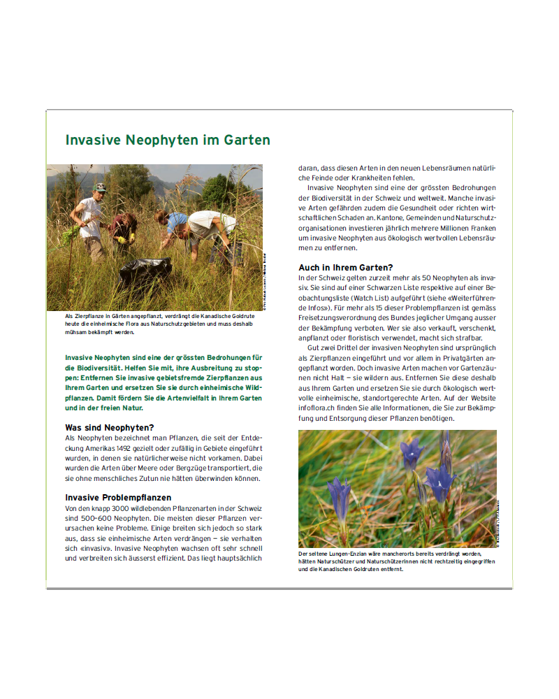 Vous trouverez dans ce dépliant des informations claires sur les espèces de plantes exotiques envahissantes présentes en Suisse ainsi que des conseils et des alternatives.»