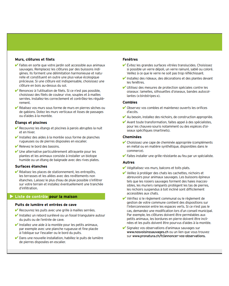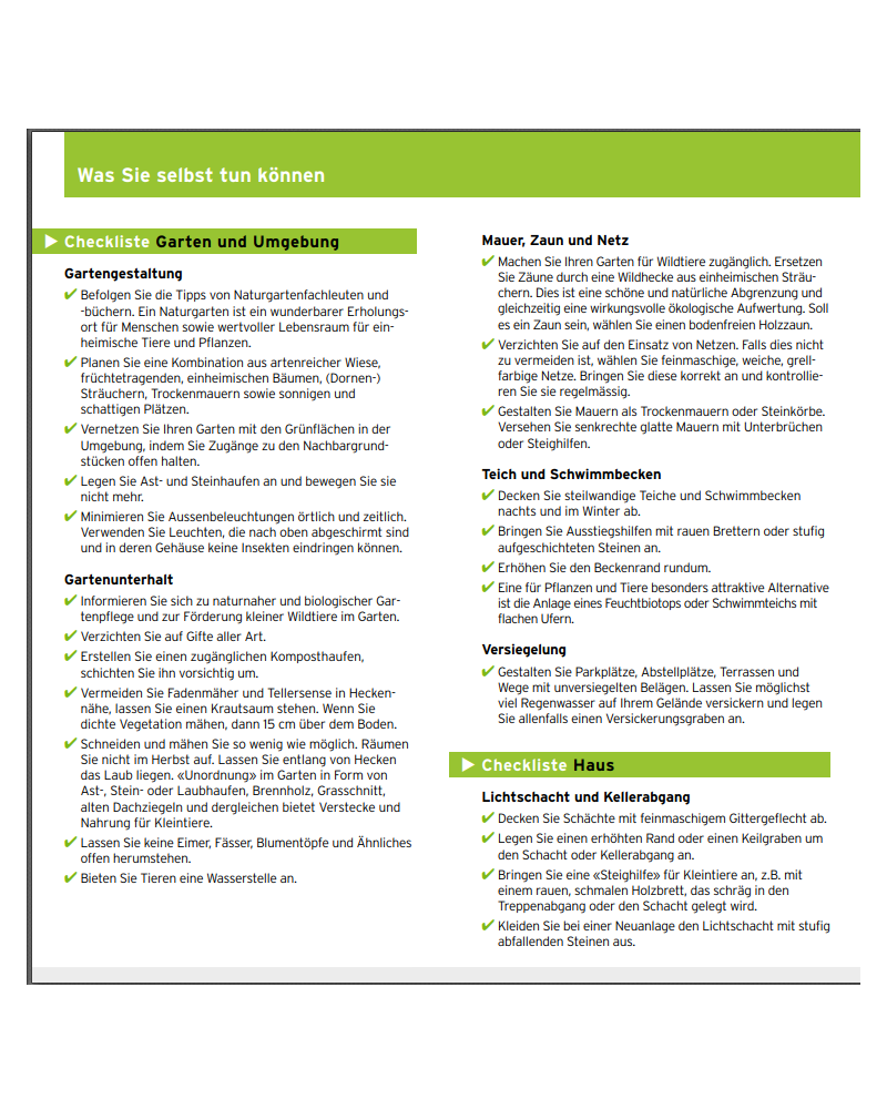Kleine Massnahmen, grosse Wirkung: Im Siedlungsraum, im Garten und rund ums Haus gibt es viele Barrieren und Fallen für Kleintiere. Häufig sind uns diese nicht bewusst. Doch sie lassen sich mit geringem Aufwand entschärfen. Viele kleine, aber auch grössere Tiere nutzen überbautes Gebiet als Teil ihres Lebensraums.